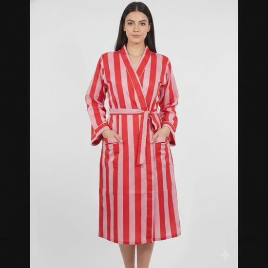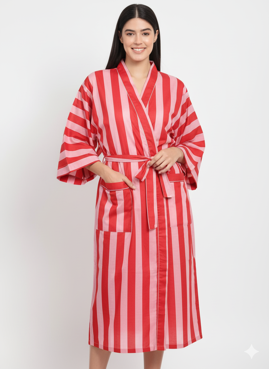 Stripe Print Bathrobe Cotton Kimono Robe Women Beach wear Red Ethnic Summer Beach Cover up