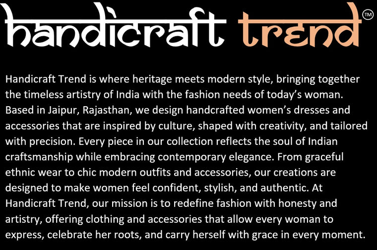 At Handicraft Trend, fashion and lifestyle are more than what you wear or place in your home—they are stories of heritage, artistry, and culture. Based in Jaipur, Rajasthan, our brand celebrates the timeless beauty of Indian craftsmanship while embracing the style of today’s world. We design and curate all products in Women’s Dresses, Accessories, and Home décor that reflect authenticity, elegance, and creativity.