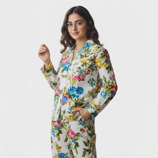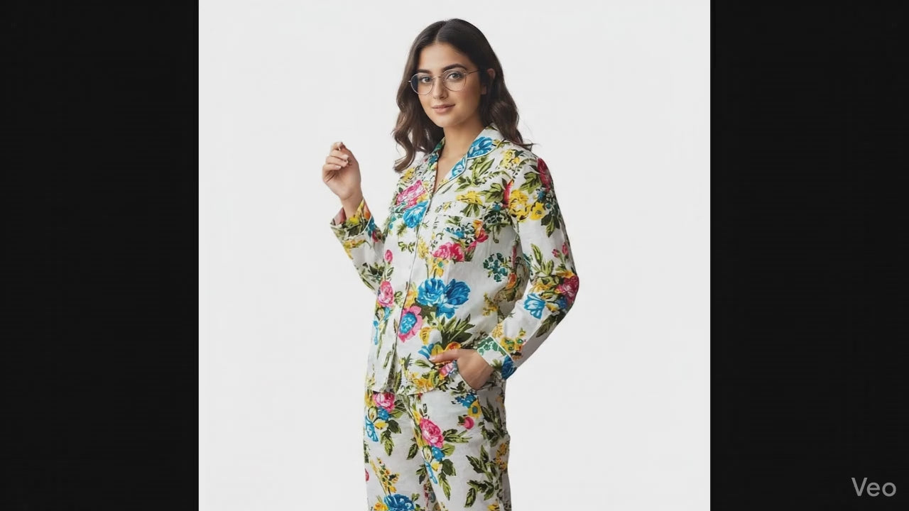 Women Lightweight Multi Floral Summer Sleepwear Cotton Soft White Night wear Top-Pajama set